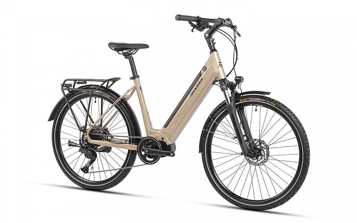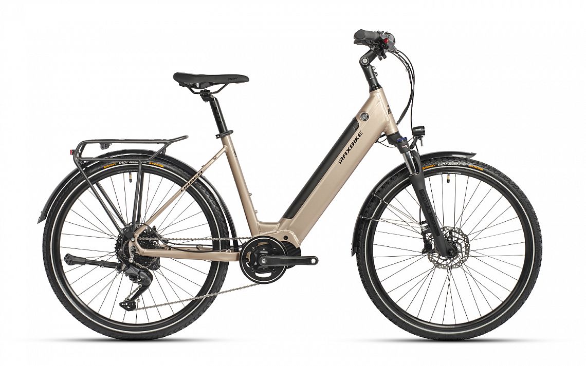 1×9 mestský elektrobicykel 26″ s nízkym nástupom a stredovým motorom Bafang M300, 80 Nm, batéria 630 Wh, 17,5 Ah, odpružená vidlica Suntour NEX-E25 LO 26“, radenie Shimano CUES SL-U4010, prehadzovačka Shimano CUES RD-U4020, sedlo DDK-D102MF Comfort Plus, výbava: svetlá napájaná z batérie elektrobicykla, blatníky, nosič a stojan